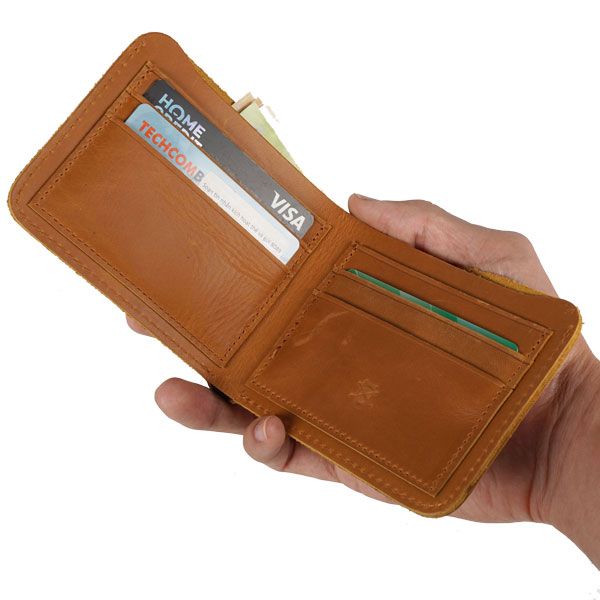 2: Thiết kế của chiếc ví ngang nam da bò màu nâu vàng.